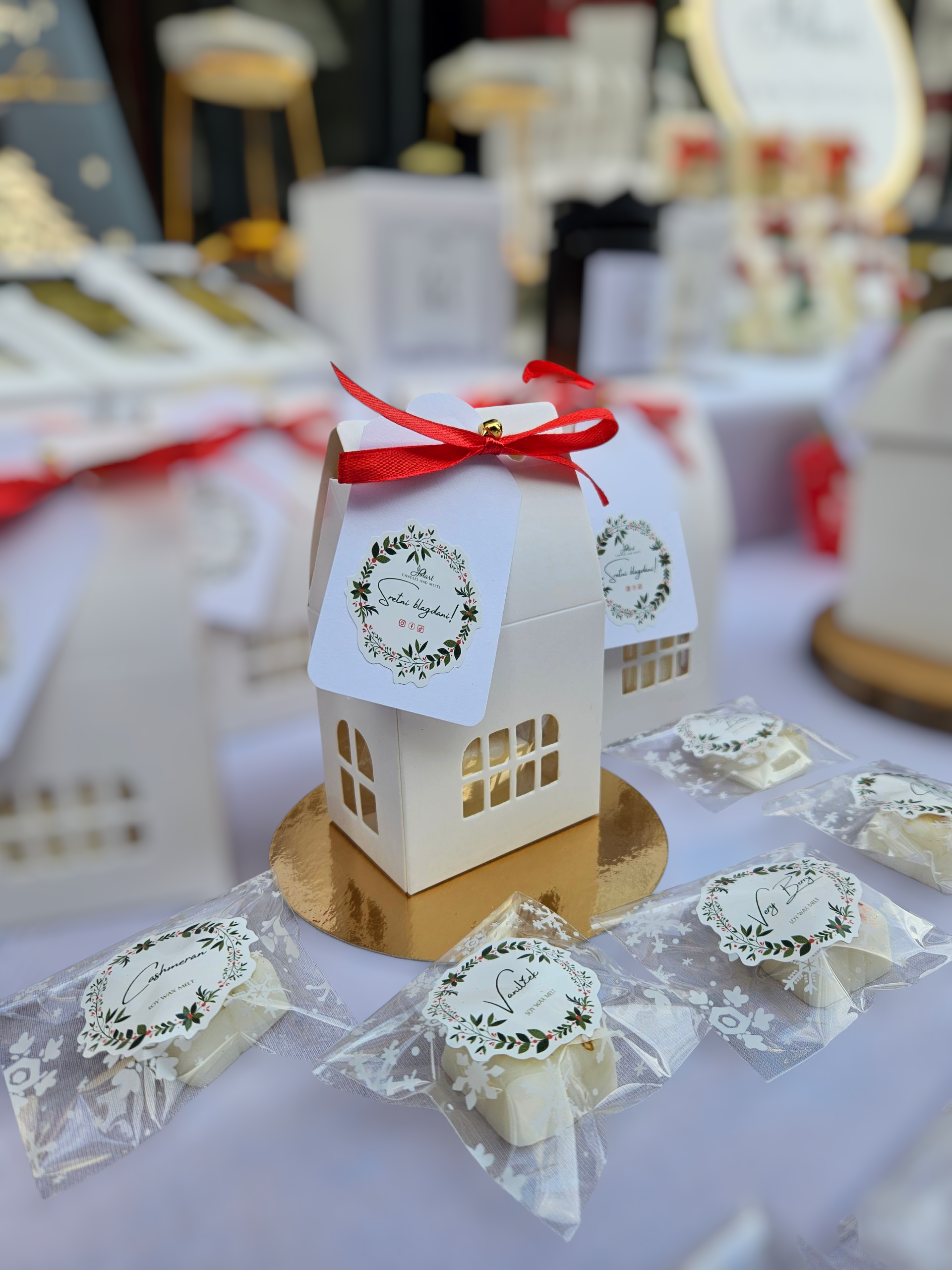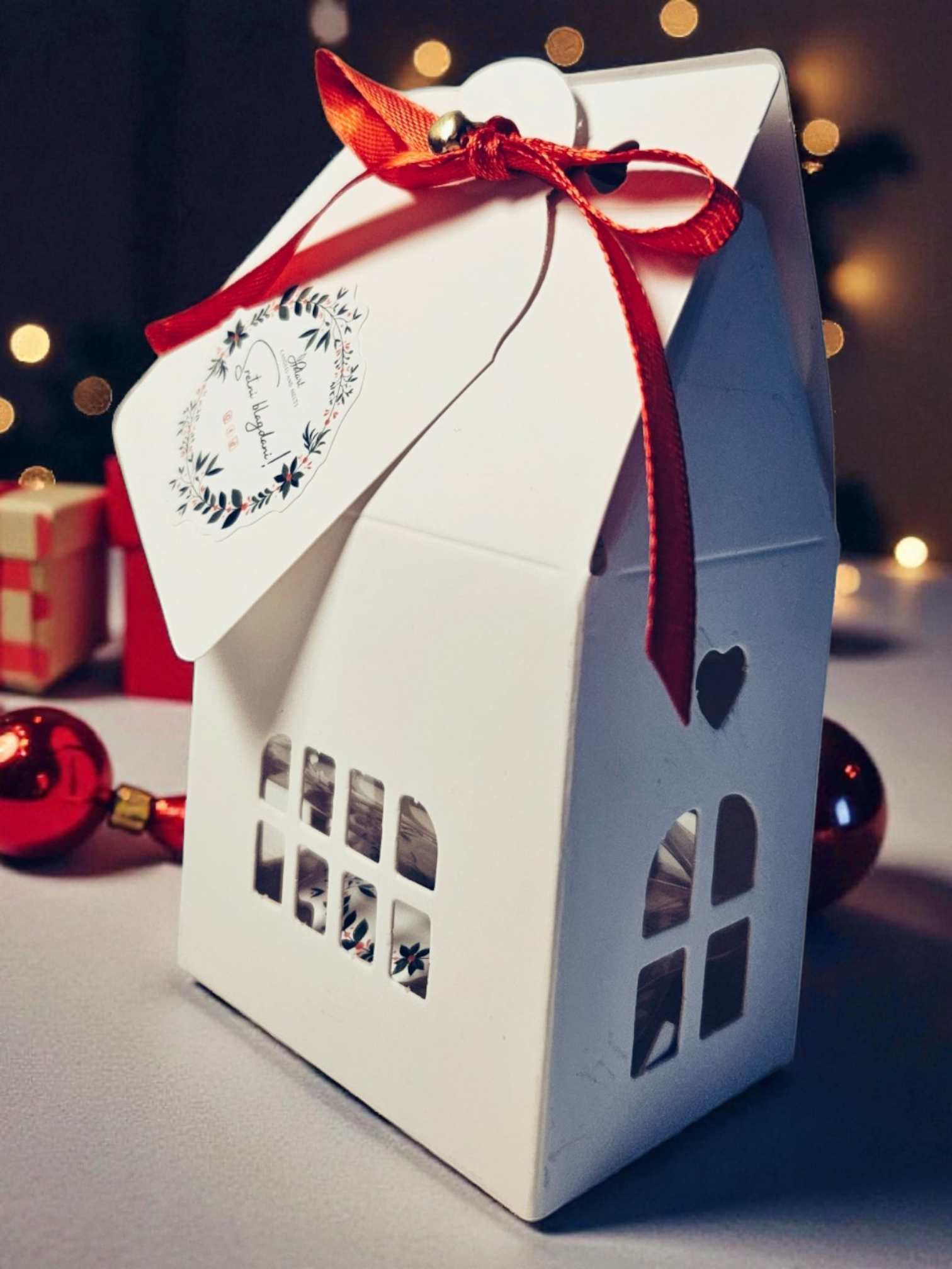 ✨️Kućice na sebi imaju karticu s natpisom "Sretni blagdani!", ispod deklaraciju s načinom korištenja voskova te su ispunjene s mini 5 voskova (svaki 8g)