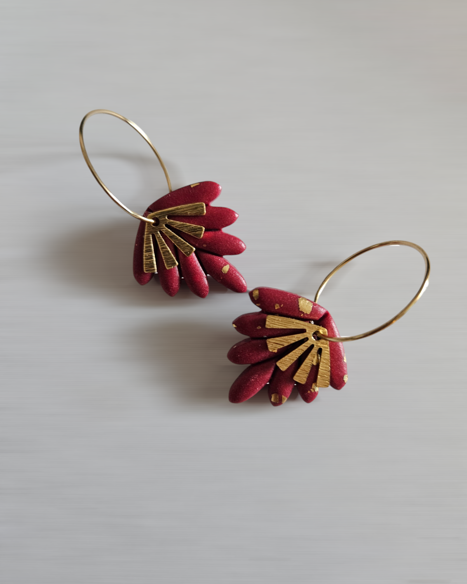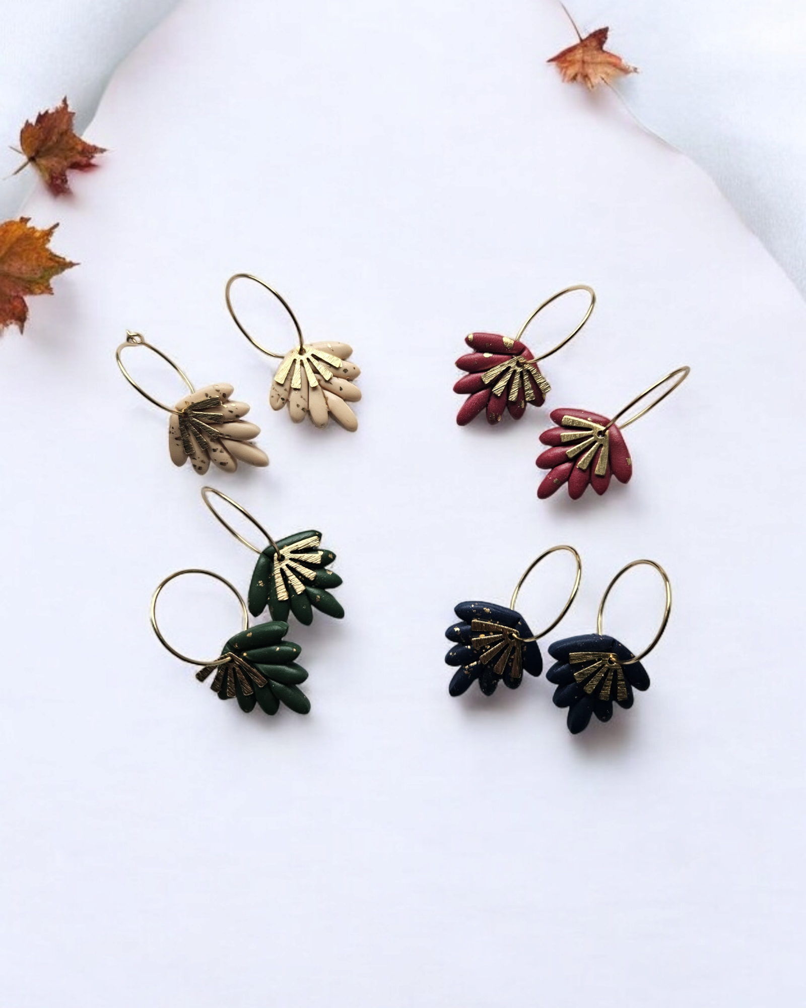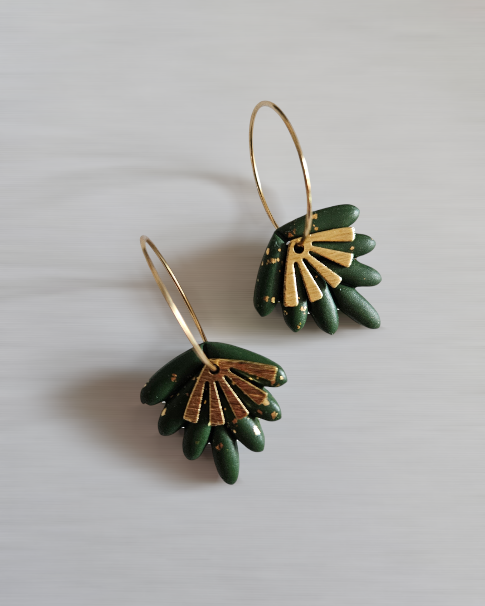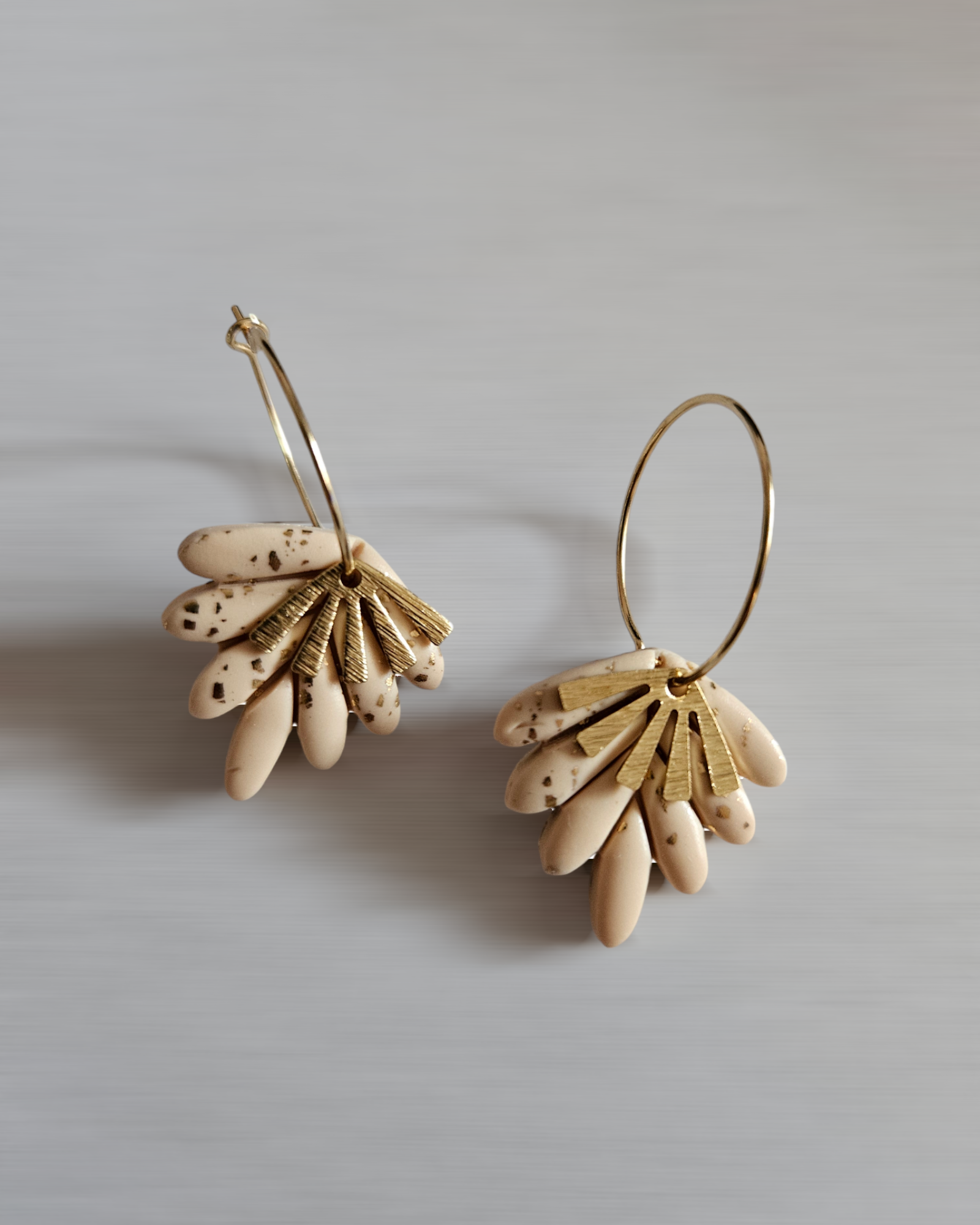 Naušnice izrađene od polimerne gline i nehrđajućeg čelika, s dekorativnim elementima od mjedi.