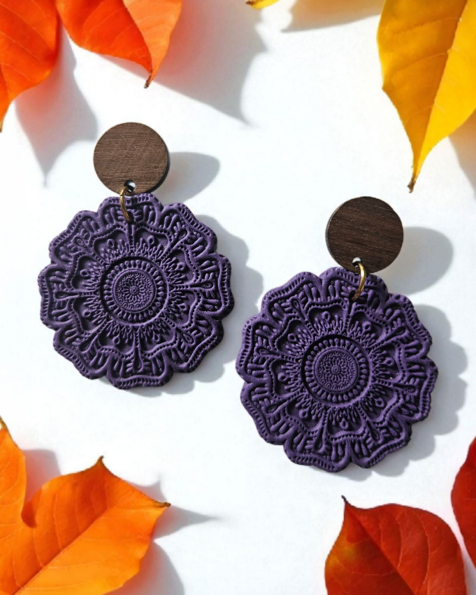 Naušnice od polimerne gline s elementima od drveta i nehrđajućeg čelika.